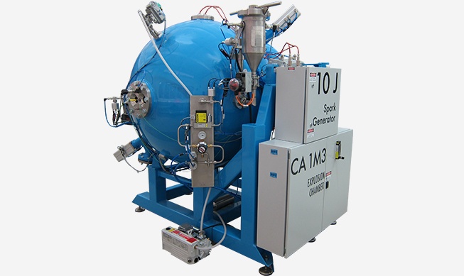 1. 爆炸舱体:体积1m3,舱体由特种钢制成。**操作压力30 bar,**测试压力40 bar。舱体上有粉尘扩散口,进气口和排气口,配气输入口,装甲玻璃可视窗,点火装置接口,温度传感器接口,压力传感器接口,闪火检测器接口,抽真空口,预留口,连接法兰和环形锁。